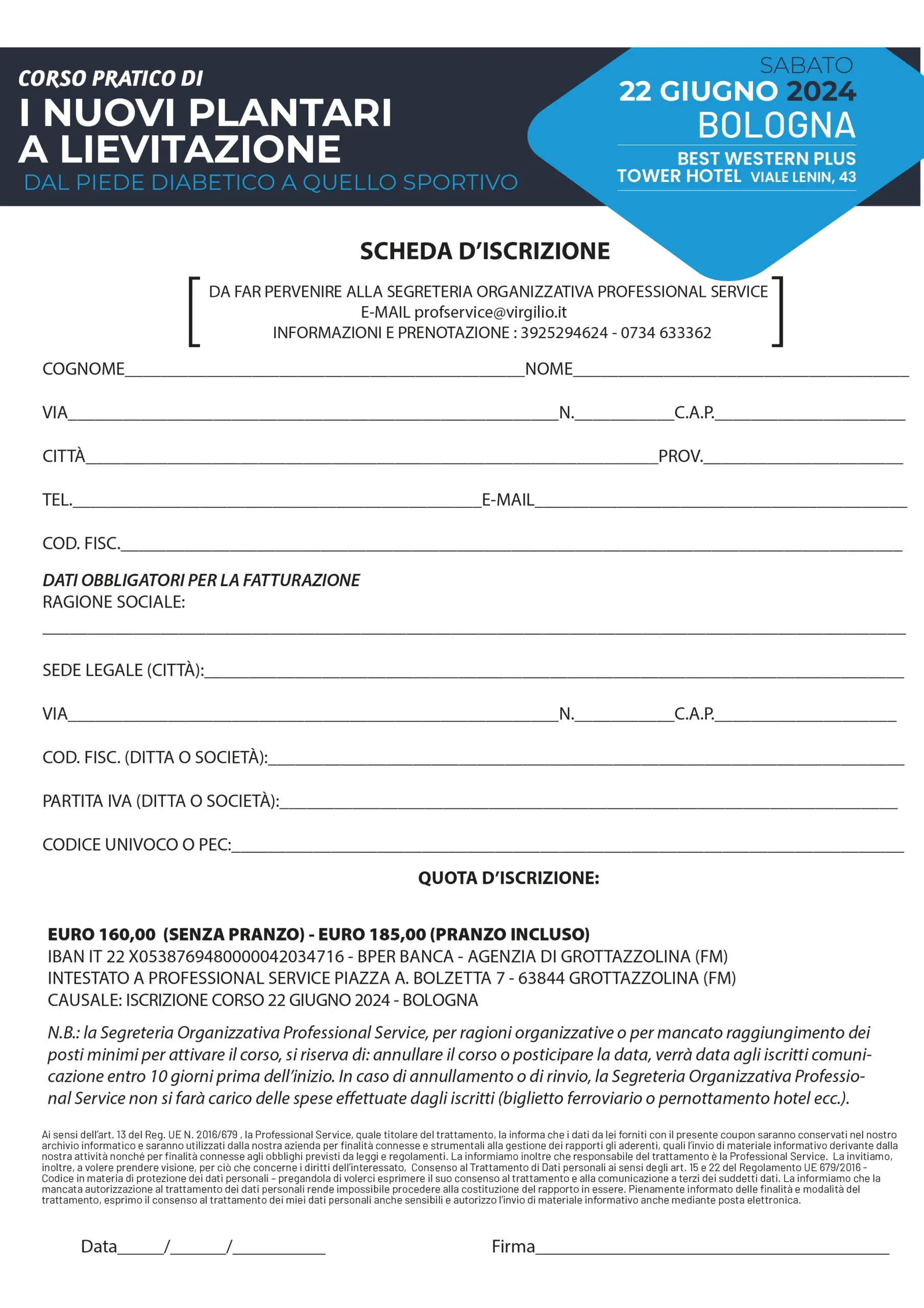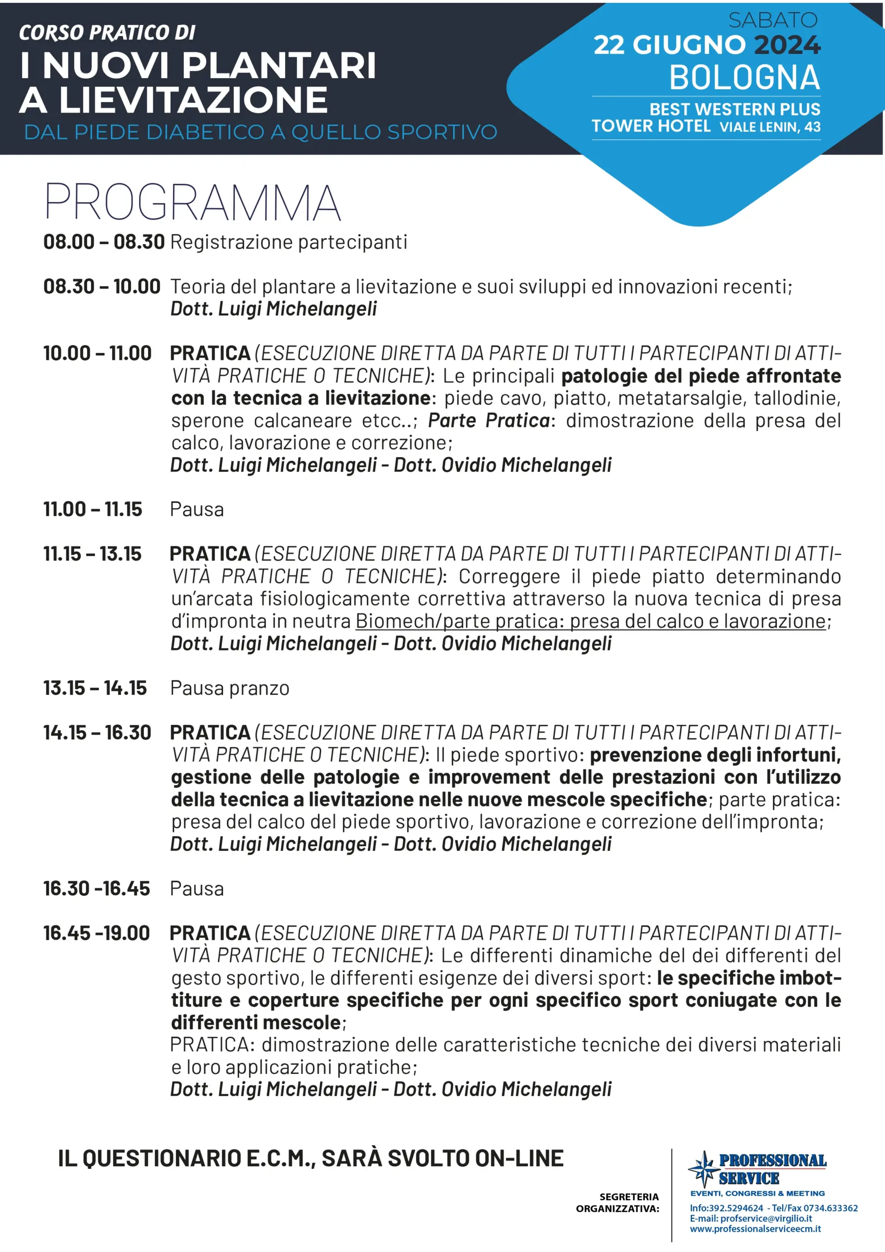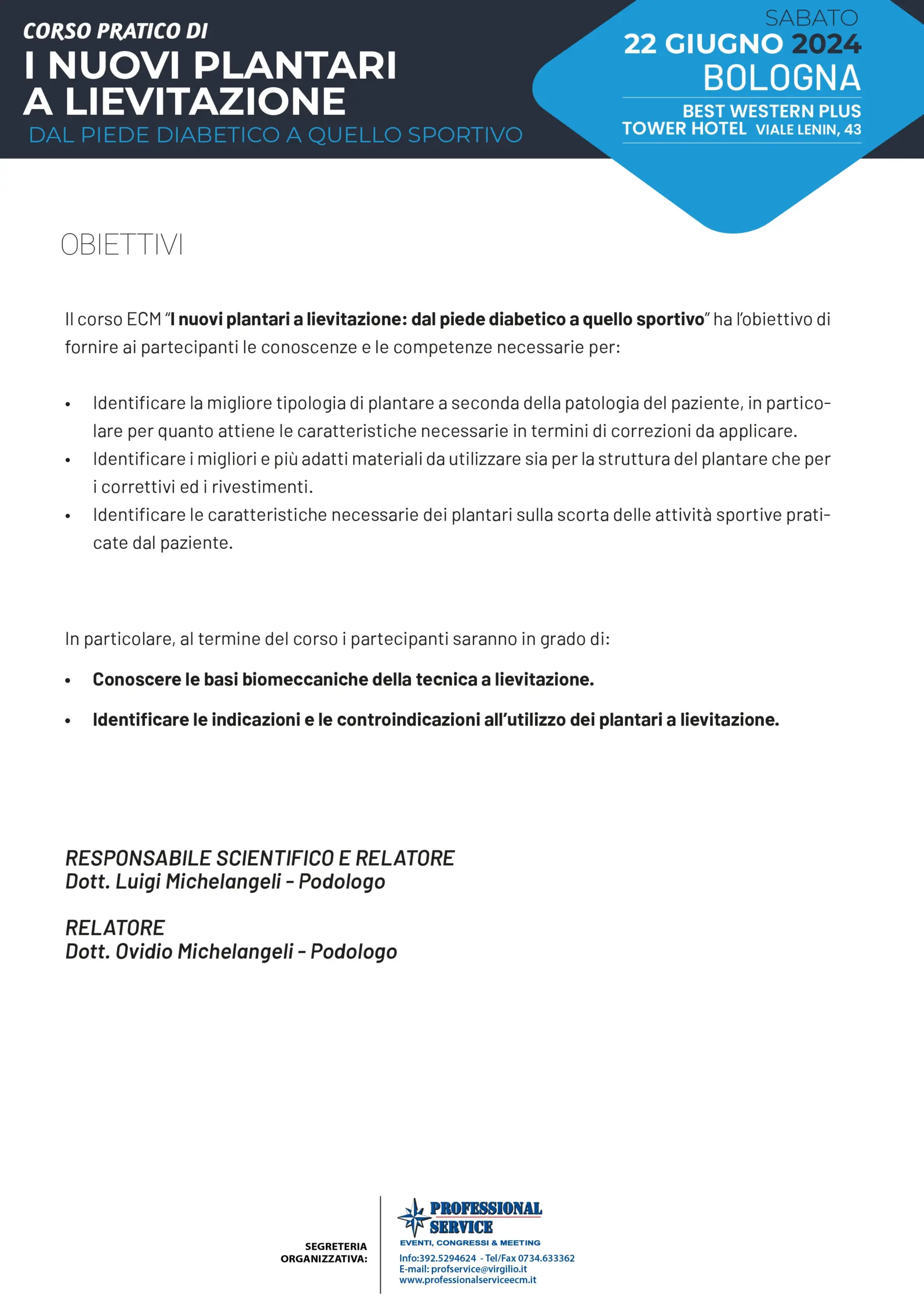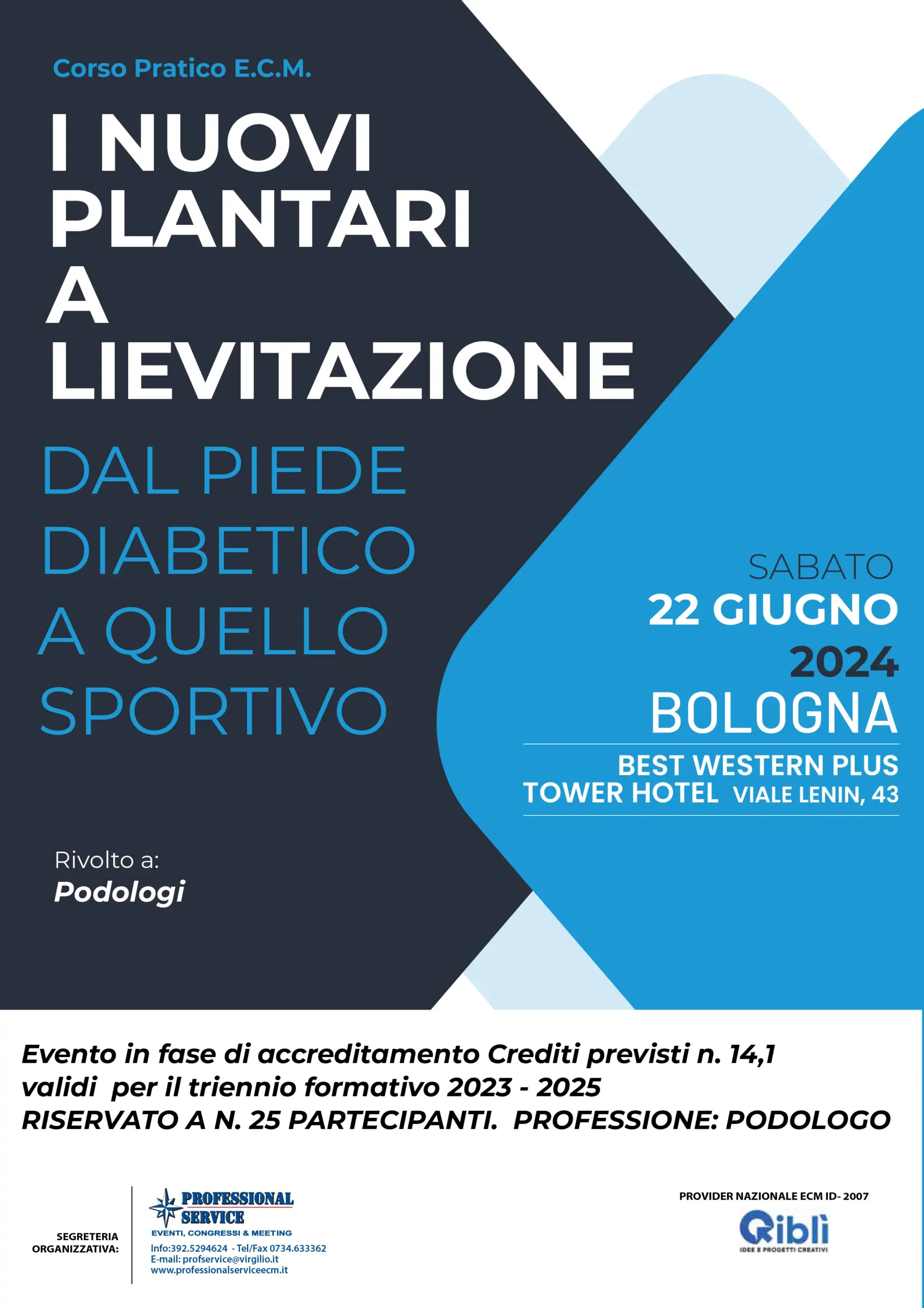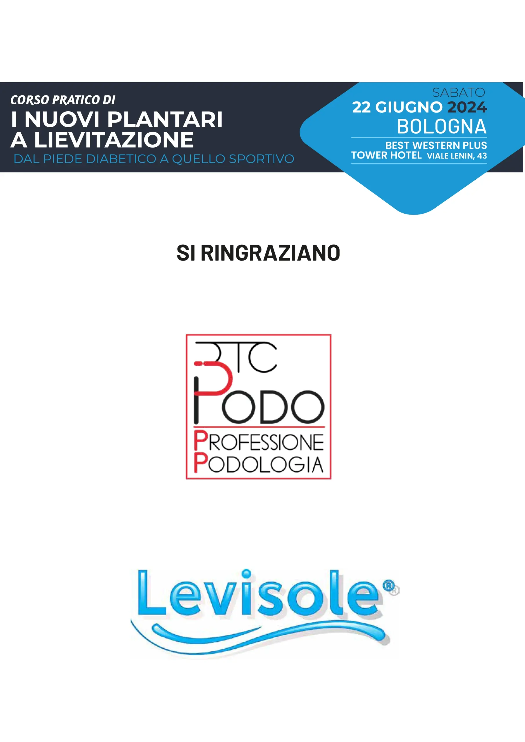 Il 22 Giugno 2024 si svolgerà a Bologna il CORSO PRATICO E.C.M. “I NUOVI PLANTARI A LIEVITAZIONE, DAL PIEDE DIABETICO A QUELLO SPORTIVO”.
