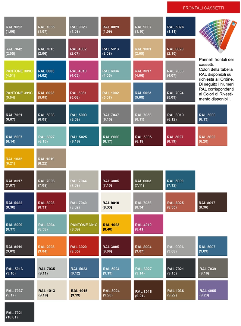 I frontali sono personalizzabili con colore a scelta all’interno di un’ampia gamma di colori RAL disponibili.