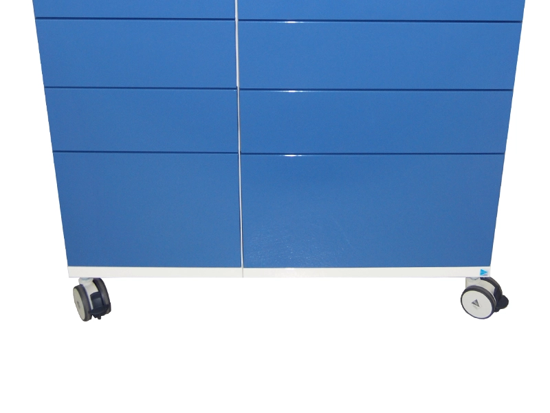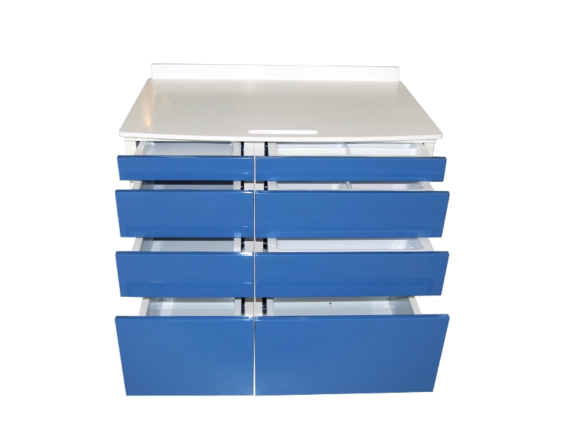 Servomobile con larghezza 86 cm. Configurazione standard con 8 cassetti (2 M1, 4 M2 e 2 M4) con frontali in metallo senza maniglie e sistema di apertura Push- Pull. All’interno dei cassetti, vassoi porta strumenti. Mobile su ruote (le due anteriori con freno) per la movimentazione. Piano in Corian® con maniglia distinta a intaglio. Possibilità di supporto lampada e supporto porta- tray (Ø 12,5 e Ø 16 mm).