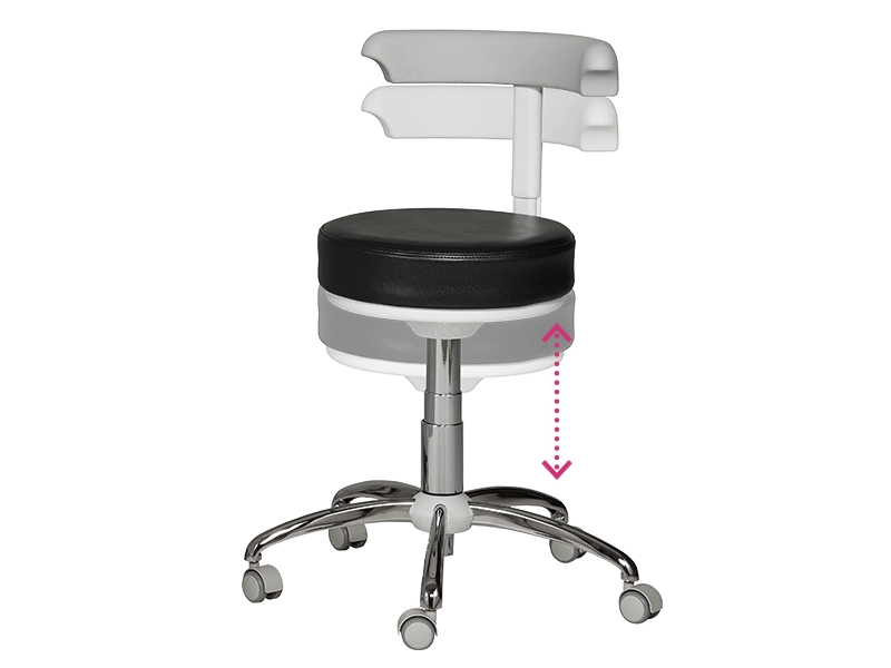 Seggiolino Operatore HP Gel con seduta circolare in schiuma viscoelastica a densità differenziata, con effetto memoria e rivestimento in Skay di altissima qualità e durata. Ideale per studi Podologici e Ambulatoriali.