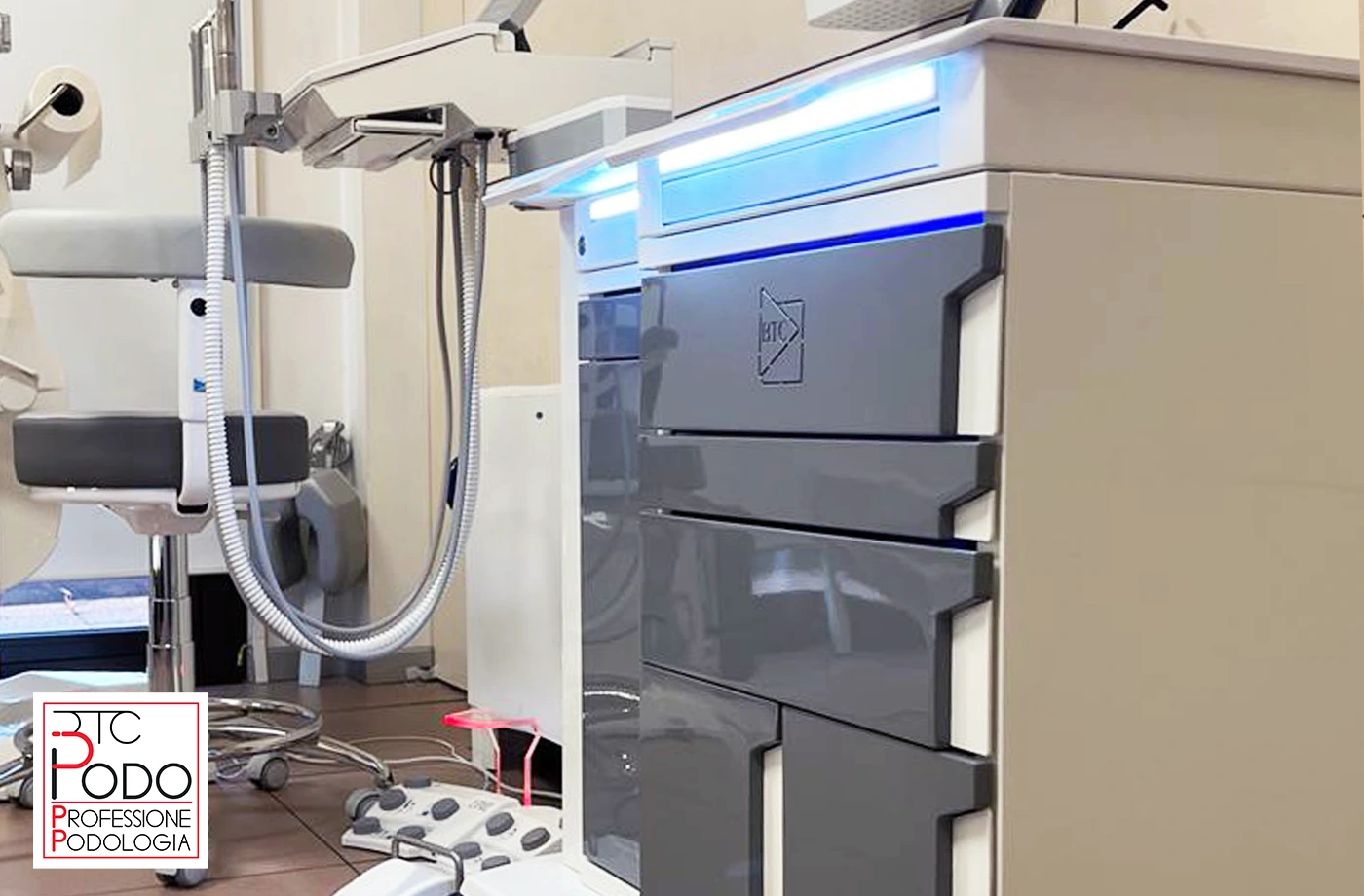 Riunito Podologico Aliseo 85, Poltrona 3MOTION con pedale wireless e Seggiolino HP Gel installati presso l’Ambulatorio Podologico del Dott. Alberto Palocci a Roma zona Pigneto.